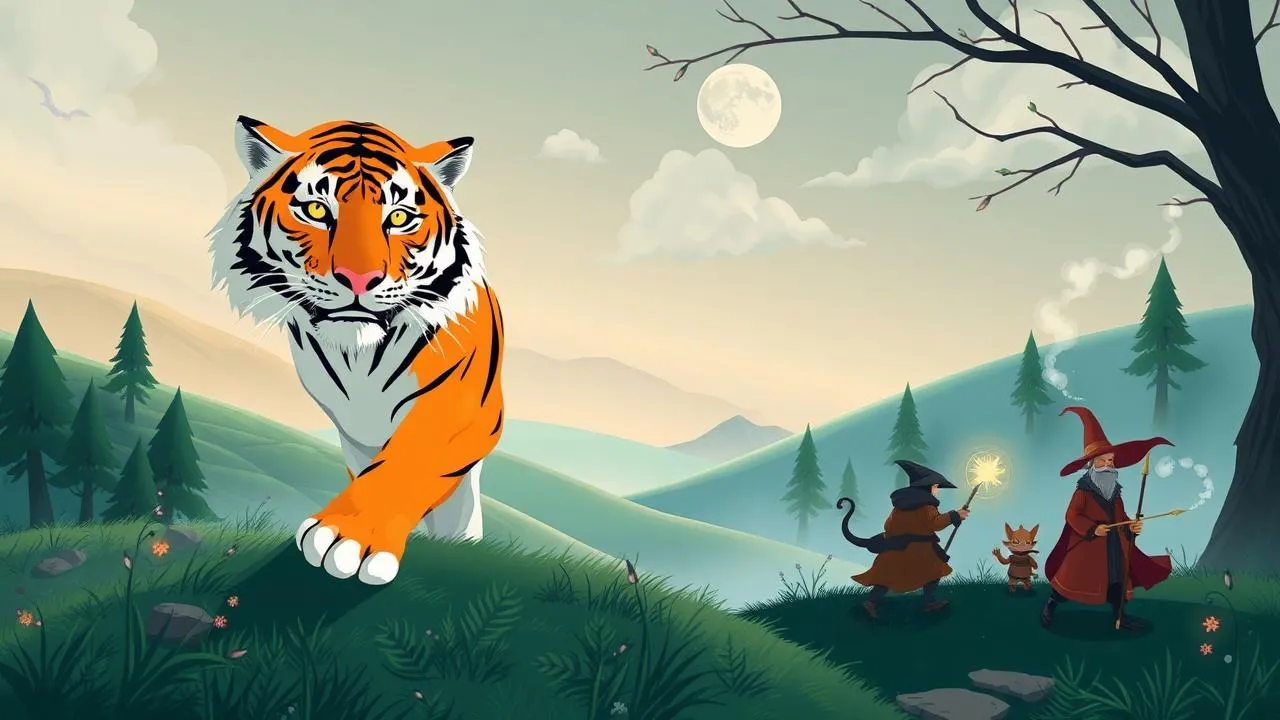Descrição: Um tigre místico protege uma aldeia de forças sobrenaturais. A fantasia é evidente na interação entre o tigre e os espíritos da montanha.